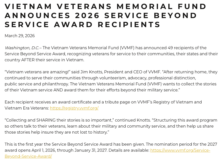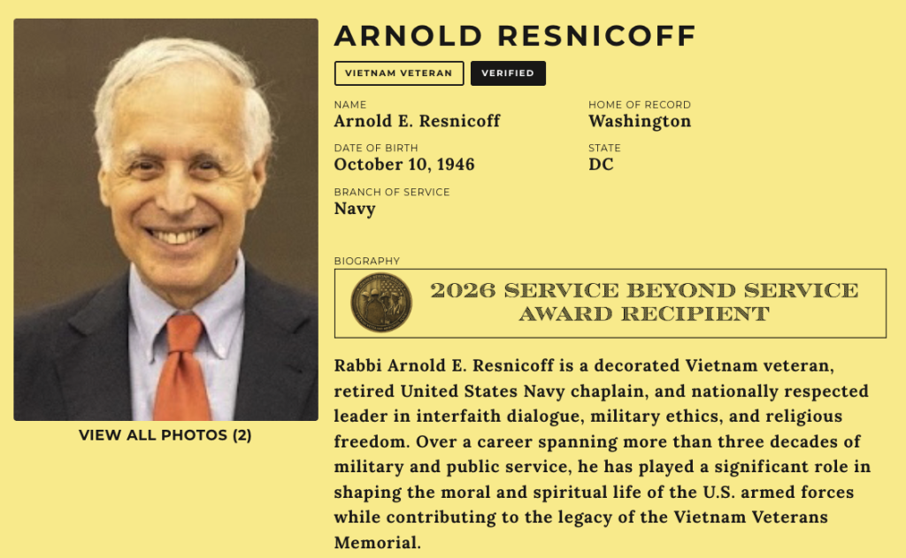 On March 29, 2026, Rabbi Resnicoff was one of the inaugural recipients of the Vietnam Veterans Memorial Fund Service Beyond Service Award.